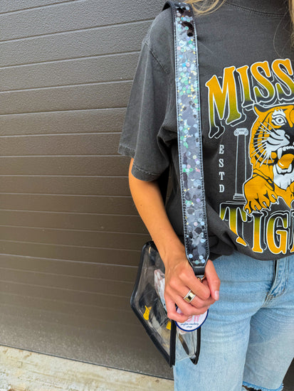 Add a bit of fun to your clear bag with the Black & Gold Confetti Bag Strap! This bag strap elevates your look while showing off your Mizzou pride (or any team) with sparkling confetti glitter in black & gold! Easily switch up your style and stand out at the tailgate or in the stands!
