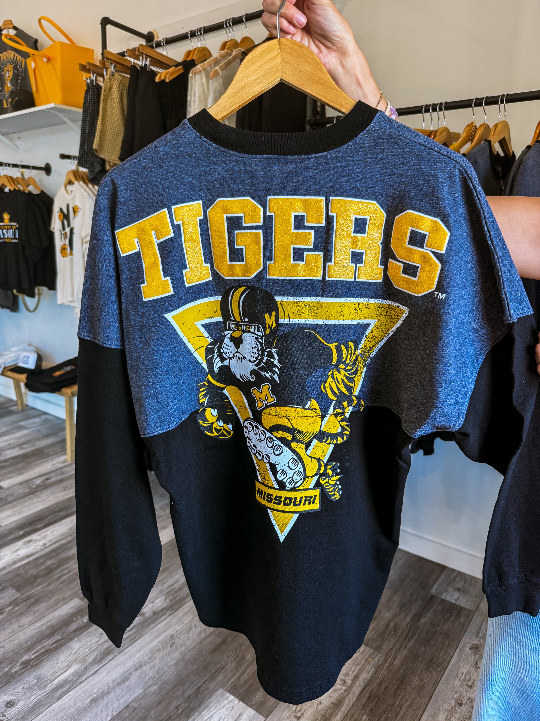If you’ve never worn a Spirit Jersey.. it will *literally* change your life 🙌🏼 The perfect oversized fit — SO comfy + cute! We’re obsessed with the large retro Mizzou design & the glitter puff details😍